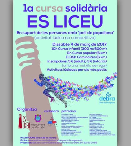 El Ajuntament de Marratxí coorganiza junto al Col.legi es Liceu, esta 1ª Cursa Solidària en favor de las personas con ‘piel de mariposa’, (una rara enfermedad genética que afecta a la piel provocando ampollas y daños al mínimo roce que tiene la persona con cualquier objeto, incluso con la ropa).