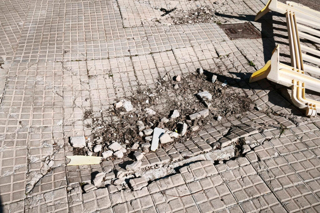 La acera está literalmente destrozada. Los adoquines están hechos añicos y se convierten en una trampa mortal con tramos impracticables. Es un riesgo evidente para cualquier peatón y especialmente para personas mayores, familias con carritos o personas con movilidad reducida. No hace falta ser técnico municipal para verlo.