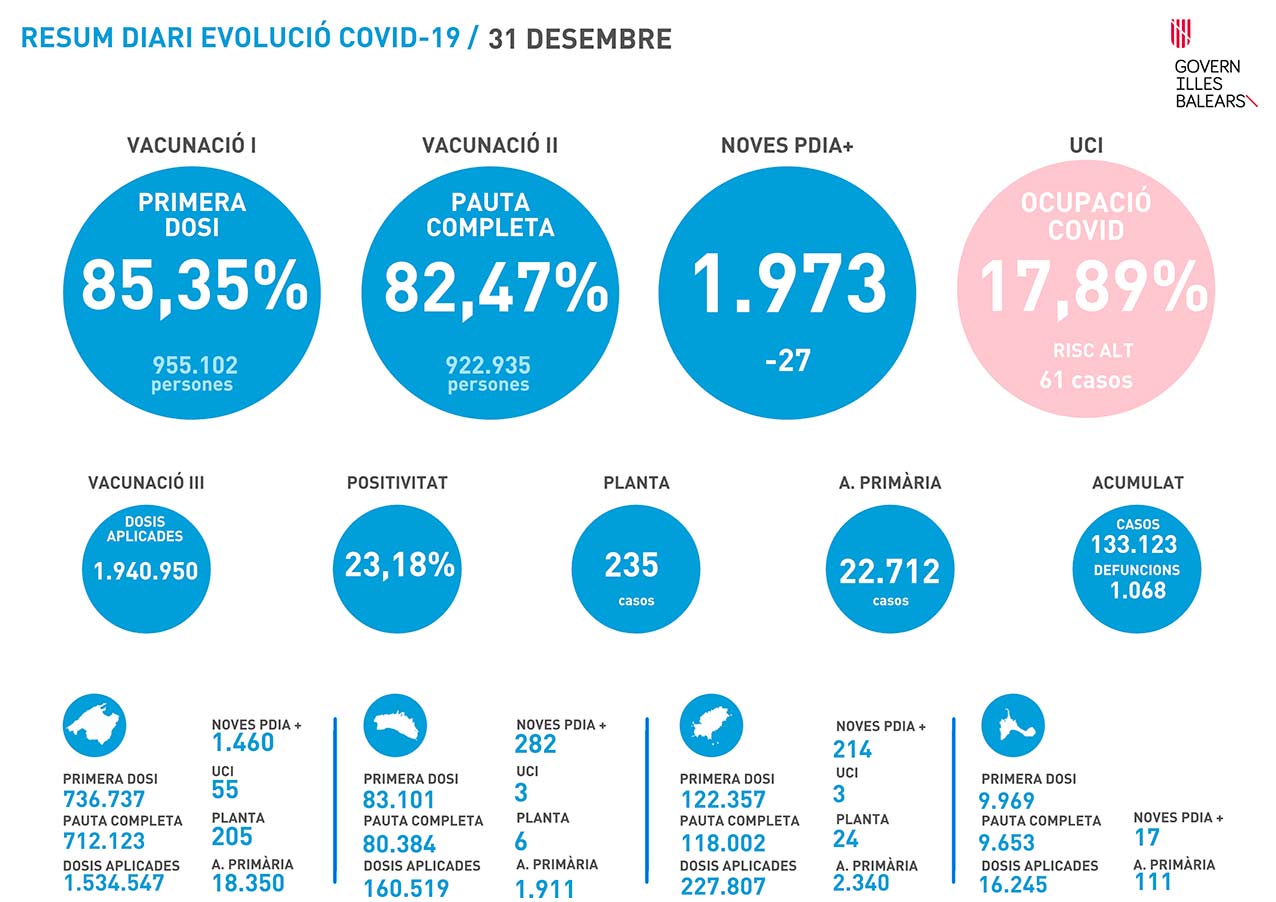 Salut comunica este 31 de diciembre 1973 contagios de coronavirus en las Islas, lo que supone un ligero descenso respecto a las cifras del jueves. Son 27 casos menos. El acumulado es de 133.123 casos.