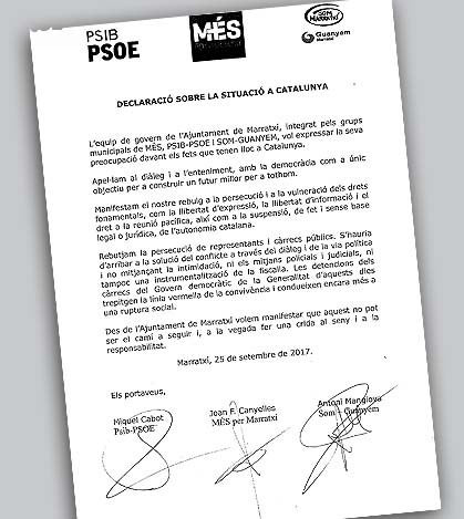 Las posturas son diversas frente al Referéndum soberanista de Catalunya que se celebrará (o no) el próximo domingo, 1 de octubre. Por tanto, el pleno de septiembre del Ajuntament de Marratxí también tocó el tema. El equipo de gobierno, integrado por los grupos municipales de Més, PSIB-PSOE y Som-Guanyem, presentó una carta abierta a la adhesión, exactamente la misma que se aprobó en el Consell de Mallorca, que no fue secundada por el resto de los partidos.