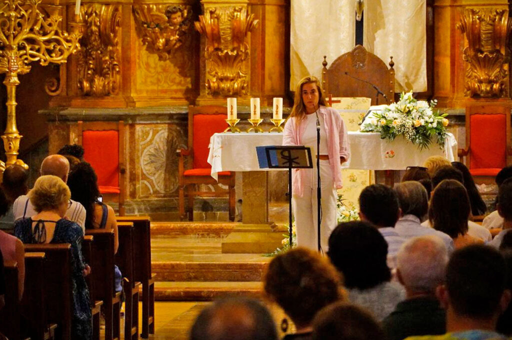 El pregón ha comenzado a las 20:30 horas. Cata Coll, visiblemente emocionada, ha abierto su discurso agradeciendo al municipio la oportunidad de ser la pregonera de unas fiestas que, según ha dicho, “recuerda con cariño desde que era pequeña”. Sus recuerdos llenaron la iglesia de nostalgia y complicidad: “Subirme a las atracciones, los coches de choque, correr entre los tenderetes, mirar cada juguete o comer un helado de almendra”, relataba la portera.