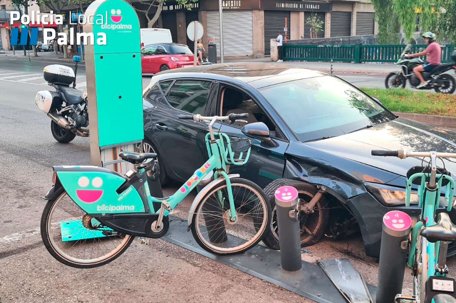 La Policía Local de Palma investiga a un conductor que perdió el control de su vehículo, colisionó primero con un coche aparcado y acabó destrozando parte del servicio público de bicicletas.