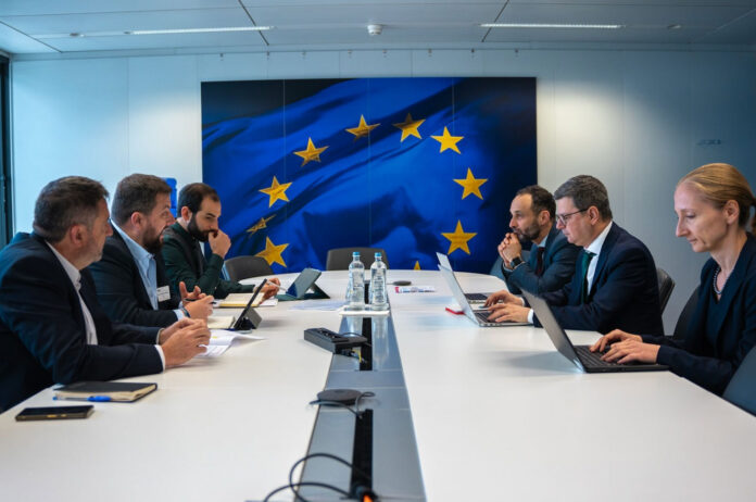 La delegación, encabezada por Joan Serra, junto a Jordi Prunés y Tolo Gili, se ha reunido con el equipo del vicepresidente ejecutivo europeo Raffaele Fitto.