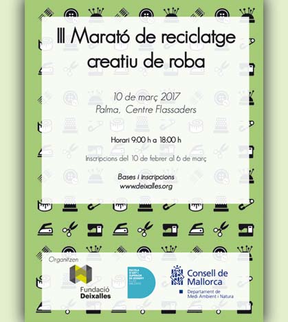 La III Maratón de Reciclaje Creativo de Ropa de Mallorca se llevará a cabo el 10 de marzo de 2017 de las 9:00 a las 18:00h. en el edificio del Centre Flassaders (Carrer de la Ferreria 10, Palma).