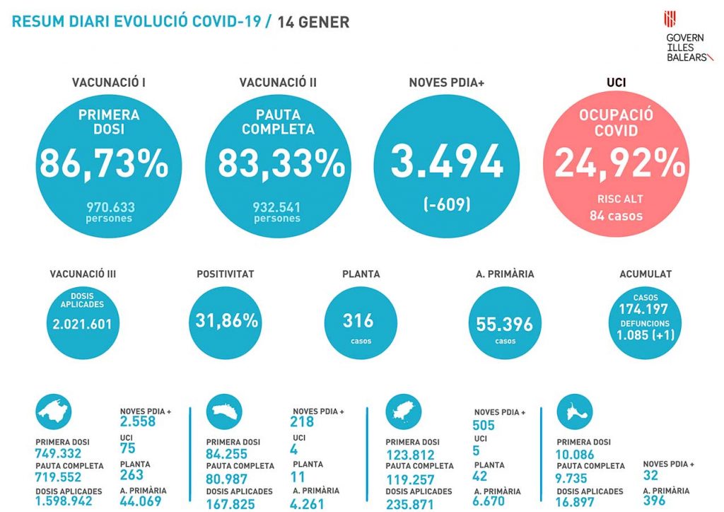 El sistema sanitario de Baleares sigue tensionado debido a la sexta ola del coronavirus. Este viernes 14 de enero, Salut ha comunicado 3.494 nuevos contagios de Covid 19; son 609 menos que le día anterior, pero las cifras se mantienen disparadas.