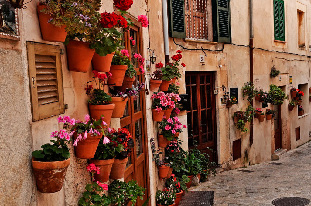 Situado en la Serra de Tramuntana, este pueblo empedrado enamora con sus calles estrechas, casas de piedra con contraventanas verdes y flores en cada rincón.