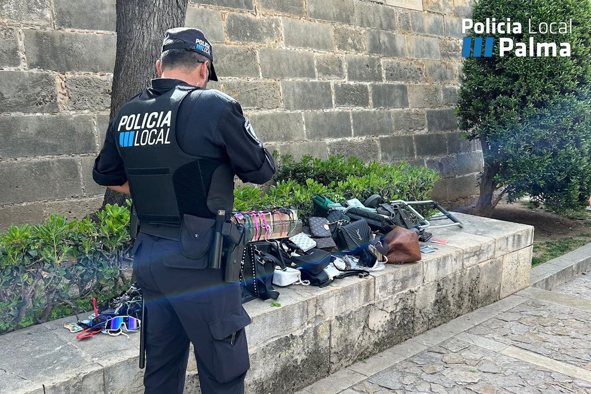 Ocurrió el pasado sábado 31 de mayo, sobre las 13 hora. Dos agentes de la Policía Local de Palma adscritos al dispositivo SETUR 2025 observaron a varios vendedores ambulantes no autorizados en el Parc de Mar y Dalt Murada. Al advertir la presencia policial, emprendieron la huida abandonando parte de los objetos.