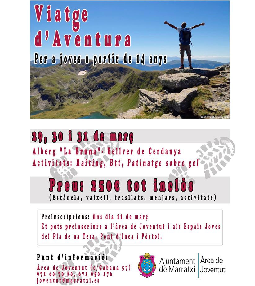 El Área de juventud del Ajuntament de Marratxí ha organizado un ‘Viatge Jove d’Aventura’ para los jóvenes mayores de 14 años a los que les apetezca vivir una aventura única y disfrutar al máximo de actividades como el rafting o el patinaje sobre hielo.