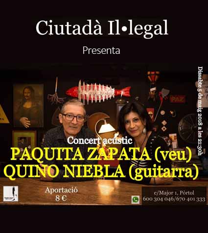 Este sábado 5 de mayo, a las 21:30h. Ciutadà Il·legal nos presenta al duo residente en Marratxí, Quino Niebla y Paquita Zapata, dos habituales y queridos en el espacio de cultura de Pòrtol. Interpretarán en acústico canciones de siempre con el estilo propio y desenfadado que les caracteriza.