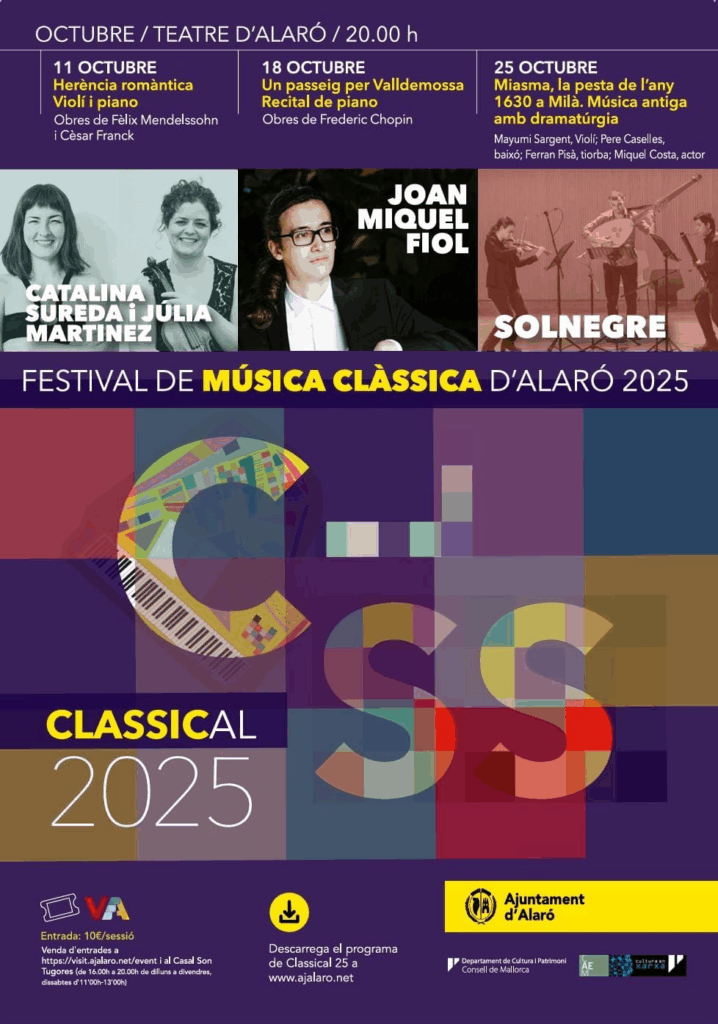 El Ayuntamiento de Alaró anuncia el inicio de la novena edición del Festival de Música Clásica CLASSICAL 2025, un ciclo ya consolidado que volverá a llenar el Teatro de Alaró con grandes propuestas musicales. Este año, el festival presenta tres conciertos con estilos y formatos muy diferentes, que permitirán al público disfrutar de una experiencia musical variada y de gran calidad. La directora del festival, Julia Martínez, la concejala de Cultura, Cati Cifre, y el alcalde, Llorenç Perelló, han presentado el programa.