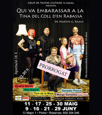 Debido al éxito obtenido, Ciutadà Il·legal (Carrer Major, 1 Pòrtol), ha decidido ampliar la representación de la comedia “Qui va embarassar a la Tina del Coll d’en Rabassa”, al sábado 16, jueves 21 y viernes 29 de junio. La comedia, representada por el grupo de teatro de Ciutadà Il·legal y escrita y dirigida por Martín G. Ramis, es una obra que trata de las vivencias de una familia a la que hay que dar de comer aparte, una madre, unos hijos, uno facha tirando a nazi, un gay… bueno, lo mejor es verla.