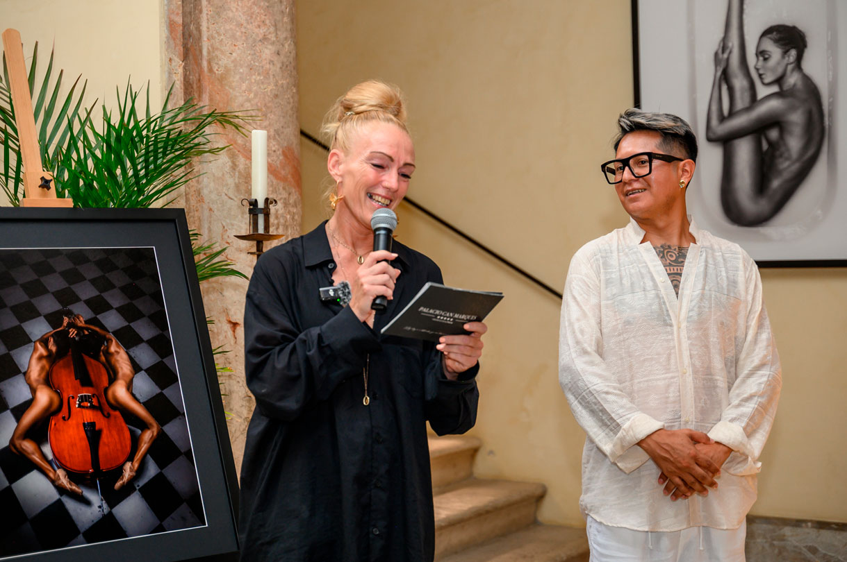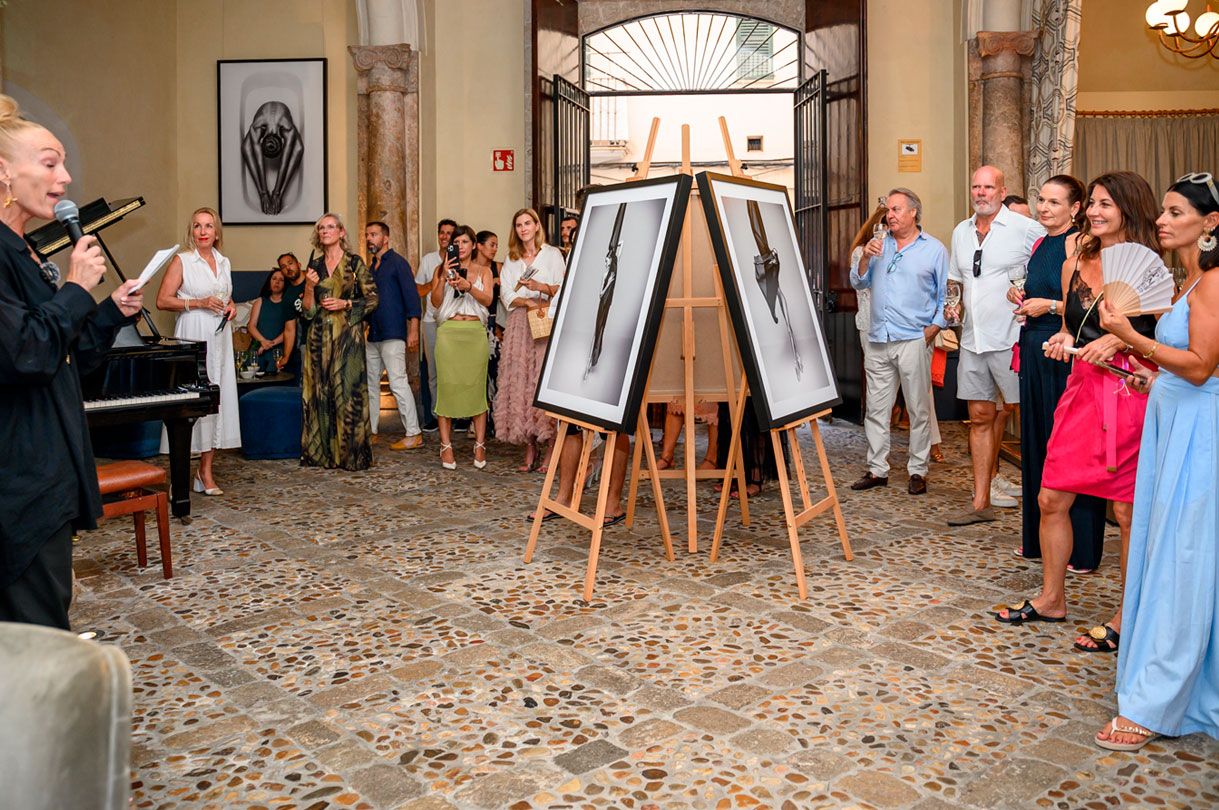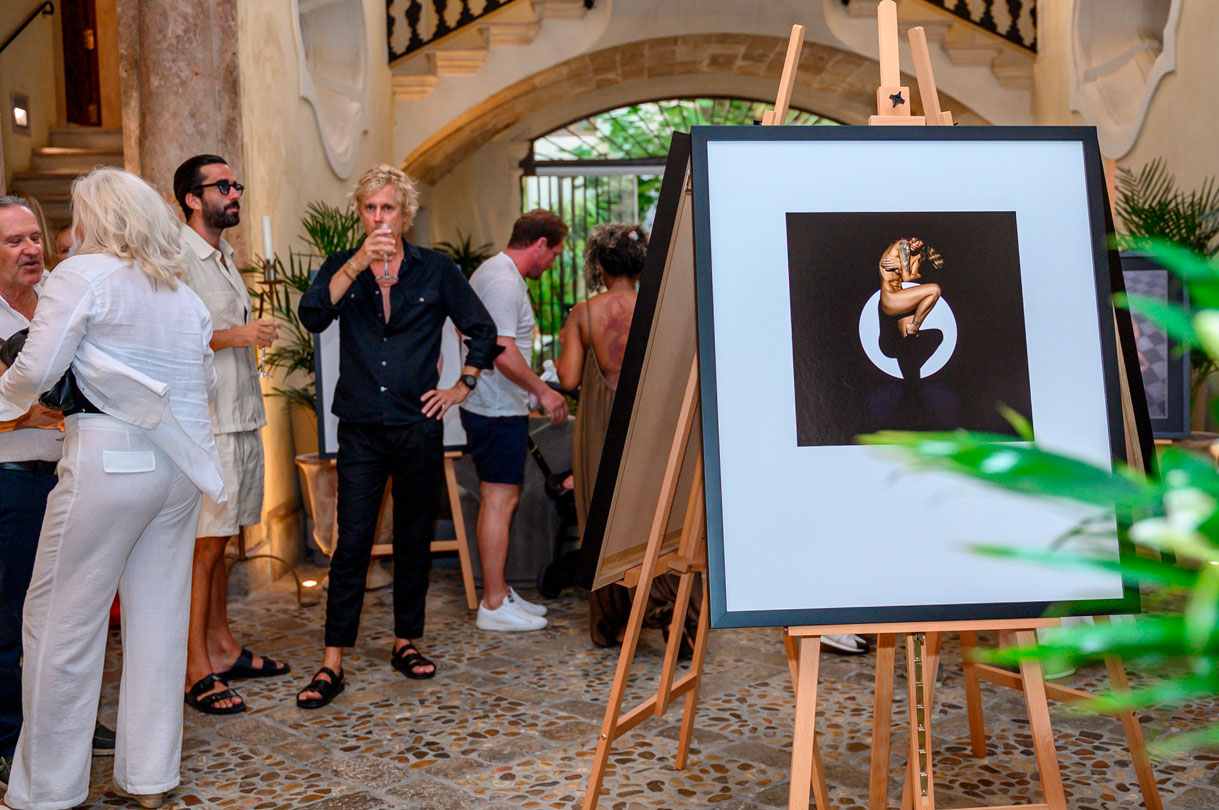 El evento, acompañado de vino, cava y agua, llevó a los visitantes por las distintas plantas del palacio. Cada nivel ofrecía nuevas obras, postales artísticas y fotografías intervenidas con pan de oro. En la biblioteca, una serie ambientada en el Club de Mar de Mallorca enfrentaba la delicadeza del cuerpo humano a la solidez de las estructuras industriales.