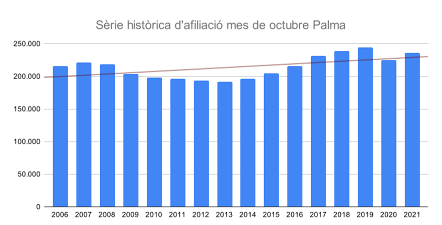 AFILIACIÓN.- Palma registraba 233.531 personas afiliadas el pasado mes de octubre (el 46,6% de las afiliaciones en Baleares). Esta cifra implica un descenso del 1,21% a nivel intermensual respecto al mes de septiembre de 2021. En términos interanuales, el incremento de personas afiliadas fue de un 9,1%.