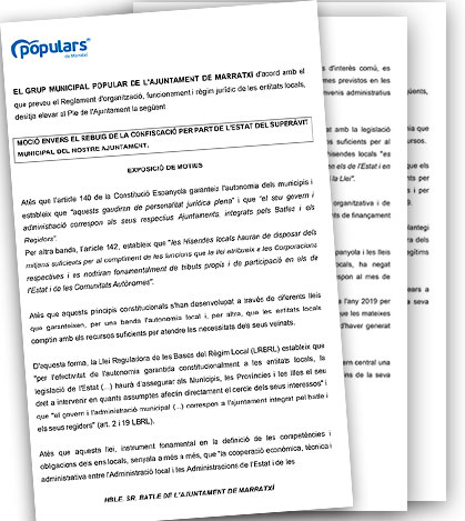 La exposición de motivos de la moción popular finaliza: “el Gobierno de España, con un absoluto desprecio a la Constitución Española y a las leyes que regulan la organización, competencias y la Hacienda de los entes locales, ha negado injustificadamente el pago a las Entidades Locales del IVA que corresponde al mes de diciembre de 2017, y está estudiando ‘confiscar’ el superávit generado en 2019 por las Entidades Locales (5.000 millones de Euros) así como también los recursos que las mismas tienen a las entidades bancarias (28.000 millones de Euros) como consecuencia de haber generado superávits desde el año 2012”.