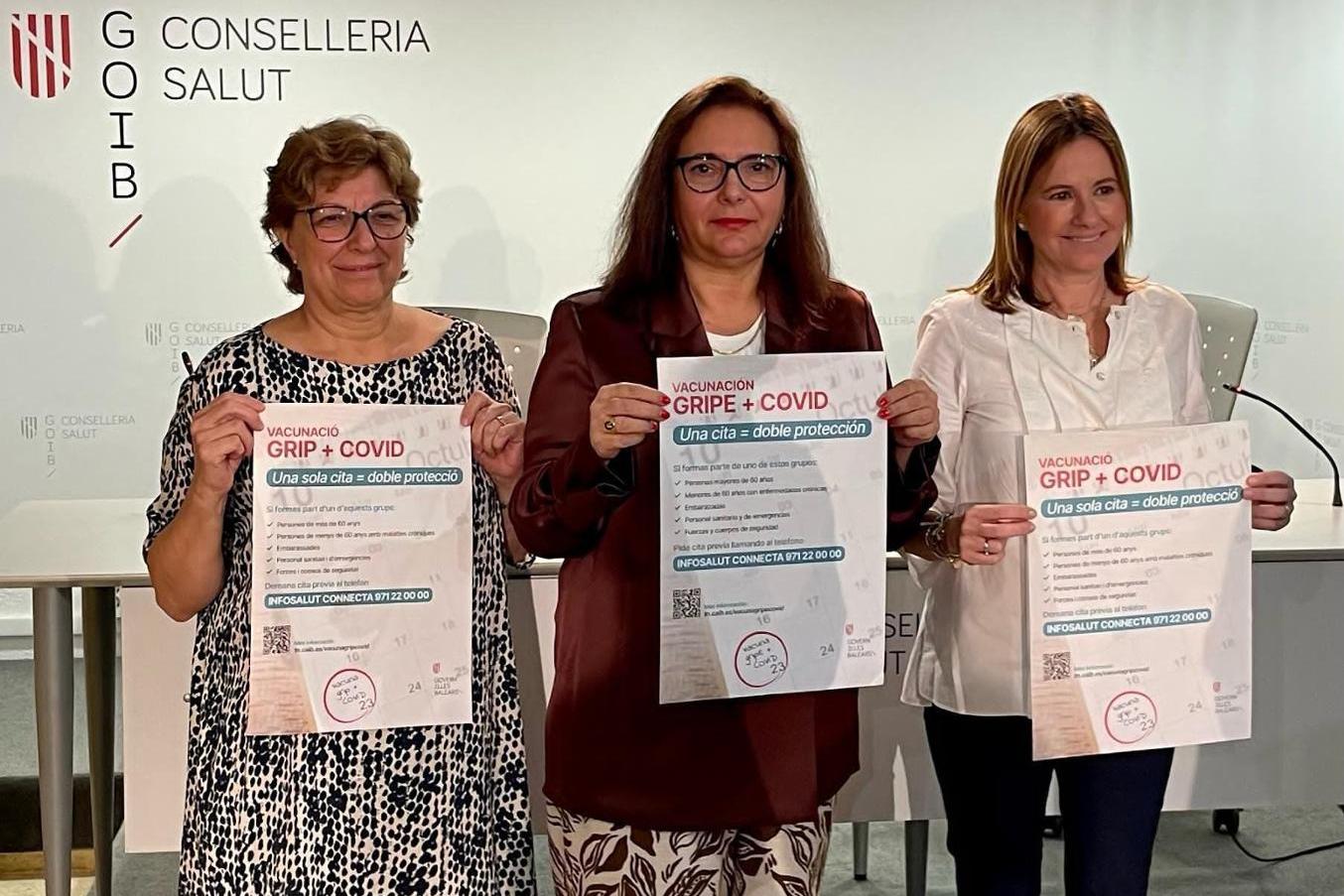 La consellera de Salud, Manuela Garcia, acompañada por la directora general de Salud Pública, Elena Esteban, y la coordinadora de vacunas, Antònia Galmés, ha presentado esta mañana la campaña de vacunación conjunta de gripe y covid para la temporada 2023-2024, con el objetivo principal de lograr un elevado nivel de cobertura en todos los colectivos de riesgo de ambas vacunas.