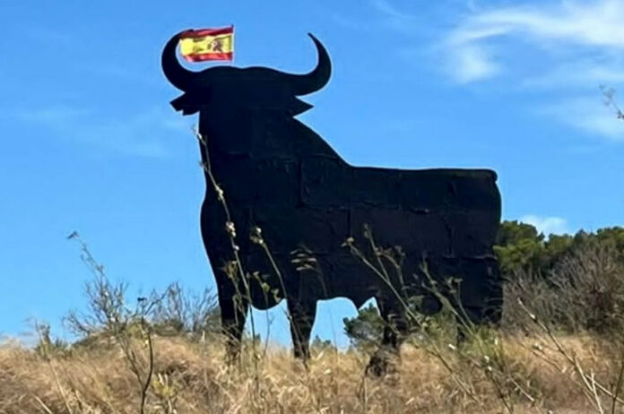 El Toro de Osborne de Algaida vuelve a lucir en negro. Apenas unos días después de aparecer pintado con la bandera de Palestina, el símbolo ha sido restaurado y recupera su imagen original. La silueta, visible desde la carretera, ha sido también acompañada ahora por una bandera de España en su asta derecha.