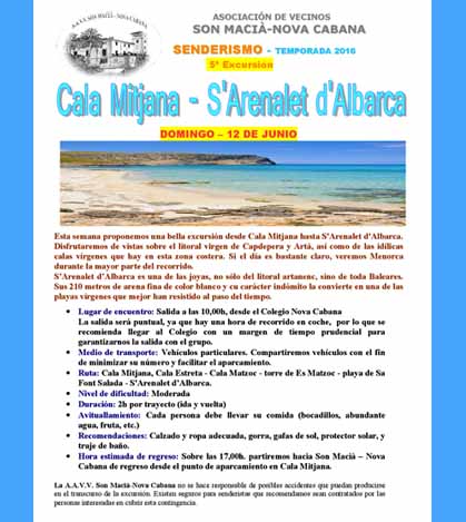 Esta semana la AAVV Son Macià-Nova Cabana nos propone una bonita excursión desde Cala Mitjana hasta S’Arenalet d’Albarca. Los asistentes podrán disfrutar de vistas sobre el litoral virgen de Capdepera y Artà, así como de las idílicas calas vírgenes que hay en esta zona costera. Si el día es bastante claro, se podrá ver Menorca durante la mayor parte del recorrido.