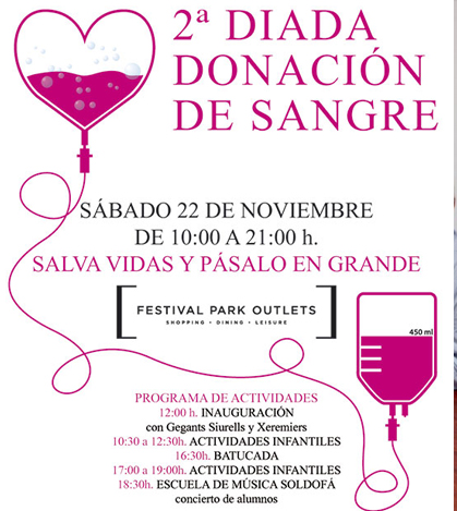 Este sábado 22 de noviembre, se celebra la segunda diada por la donación de sangre en Festival Park. Durante once horas, a partir de las 10 horas y hasta 21 horas, bajo el lema ‘Salva Vidas y Pásalo en Grande’ propondrán a los visitantes del centro comercial donar sangre para poder garantizar unas reservas adecuadas antes de diciembre, un mes en el que las donaciones siempre son más escasas y los pacientes siguen necesitando transfusiones.