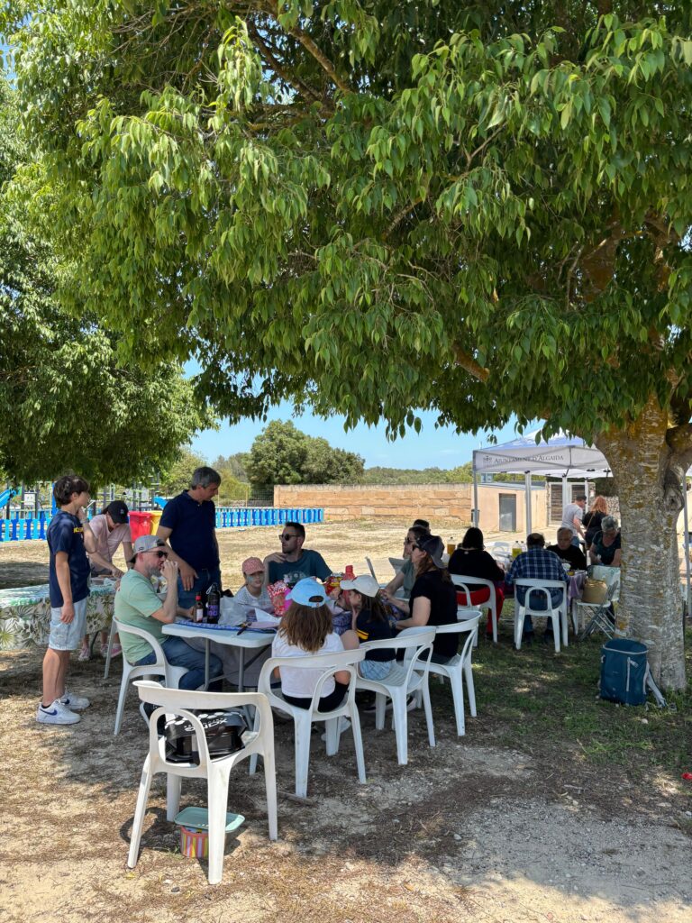 Uno de los momentos más especiales fue la comida comunitaria tipo torrada, con unas 60 personas compartiendo mesa al aire libre en un ambiente de camaradería. El Ayuntamiento facilitó las parrillas y el Servicio de Juventud ofreció bebidas, bocadillos, dulces y café.