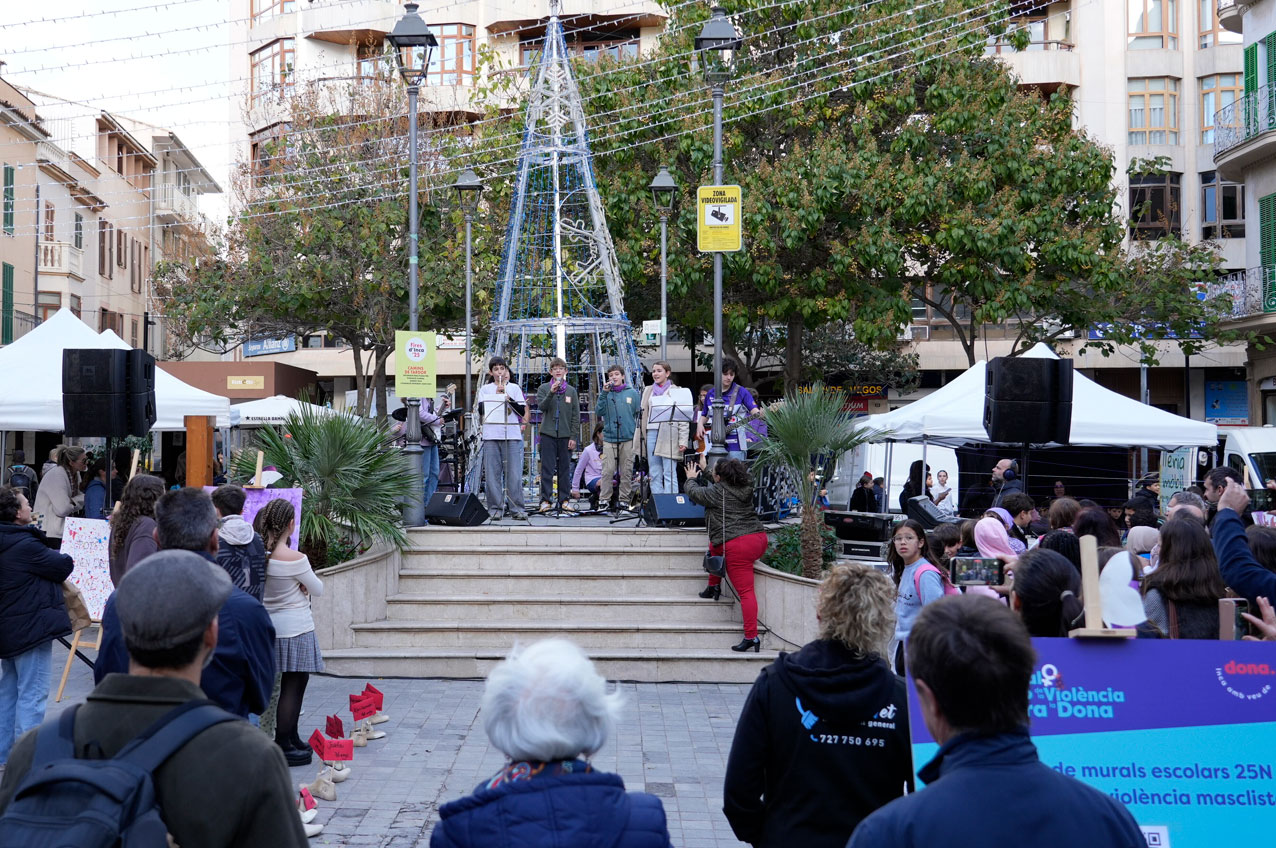 Tras el acto institucional, la plaza Espanya se ha convertido en un gran espacio de exposición ciudadana. Allí, alumnado de los centros escolares y usuarios de entidades del municipio han mostrado sus murales reivindicativos, trabajos que reflejan el impacto, la denuncia y la esperanza de toda una comunidad educativa volcada con el 25N.