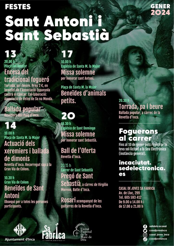 En cuanto a Sant Sebastià, el sábado 20 de enero a las 19.30 horas se celebra la misa solemne con Ball de l’Oferta a cargo de la Verbena de Inca, en la parroquia de Sant Domingo. Después, en la calle Sant Sebastià se llevará a cabo el pregón, que este año pronuncia el alcalde Moreno, el Rosario acompañado de guitarras y el tradicional Fogueró