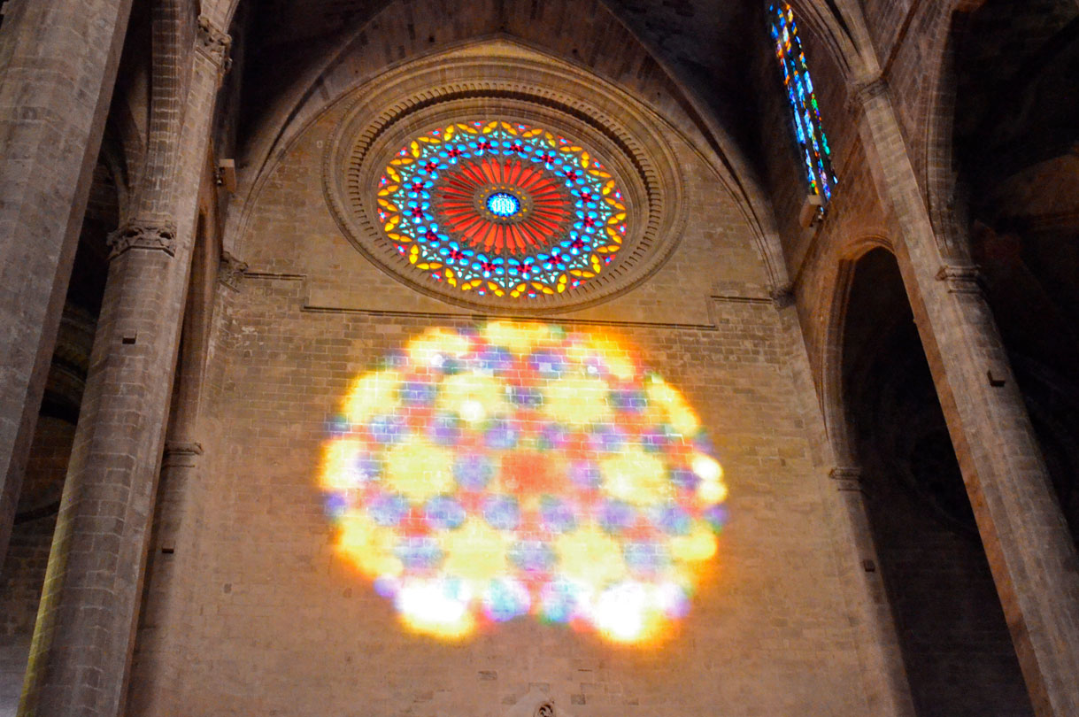 Cada 11 de noviembre y 2 de febrero, el amanecer regala a la Catedral de Mallorca una experiencia visual extraordinaria. Los primeros rayos del sol atraviesan el gran rosetón de once metros y treinta y ocho centímetros de diámetro, proyectando su reflejo en la pared opuesta del templo y creando así el famoso doble rosetón: uno de cristal y otro de luz.