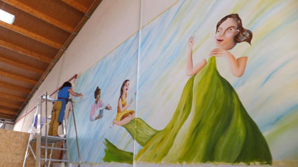 Nívola Uyà, ilustradora y muralista, está interviniendo en la pared de entrada de la nave de donaciones de Palma con un mural de 6×2 metros que simboliza el espíritu de Deixalles como ella nos lo cuenta: “Bajo un gran cielo azul y luminoso, las personas
