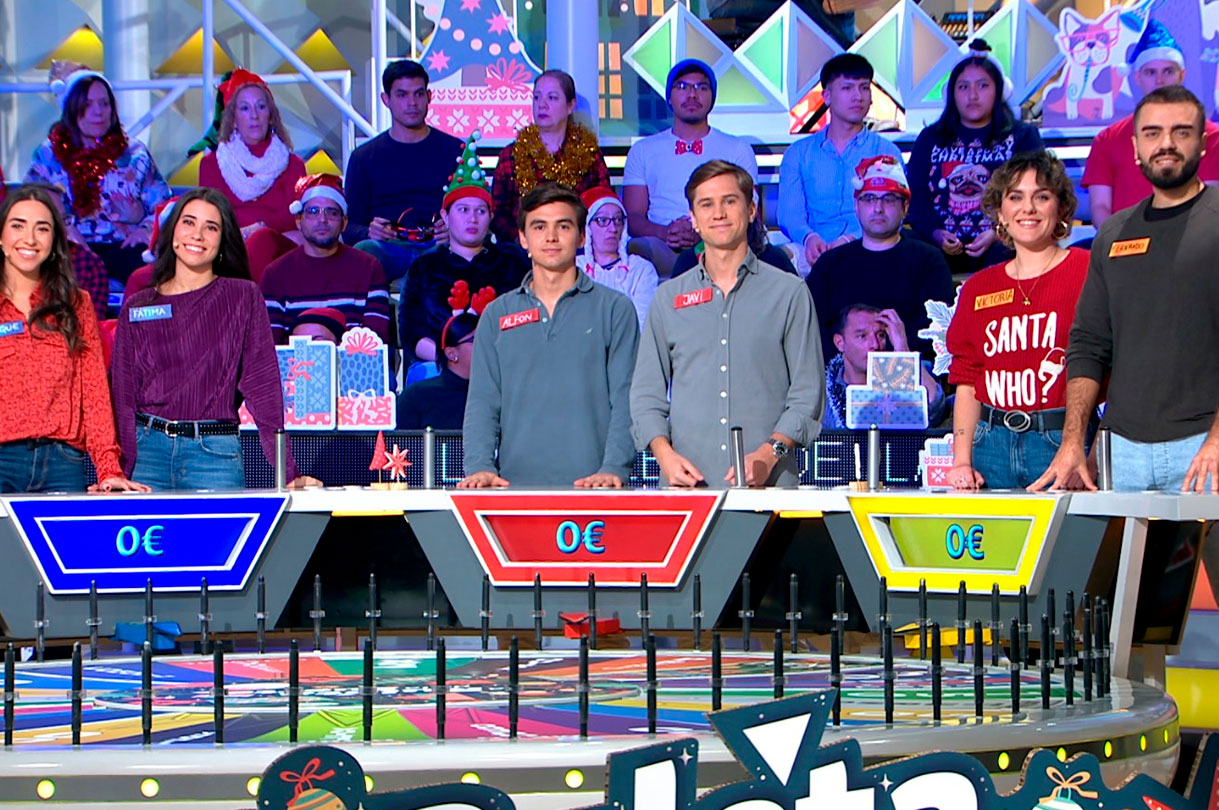 El viernes 29 de diciembre, dos días antes de Nochevieja, ‘La Ruleta de la suerte’ dedica un divertido programa a las familias. En este programa especial conducido por Jorge Fernández junto a Laura Moure y Joaquín Padilla los atriles estarán ocupados por tres parejas de hermanos. Ellos competirán en un programa muy especial en el que no faltará la emoción ni las sorpresas. Los protagonistas de esta entrega única son Fátima y Queque, hermanas sevillas, Alfonso y Javi de Madrid y Victoria y Fernando, dos hermanos que llegan desde Murcia.