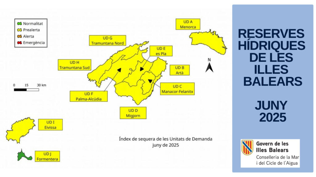 A esta situación se suma un junio extremadamente cálido y seco, calificado como el más seco en Baleares desde 1961. Según la AEMET, la precipitación media ha sido de solo 0,1 l/m², muy por debajo de los 15,3 l/m² habituales. Por islas: