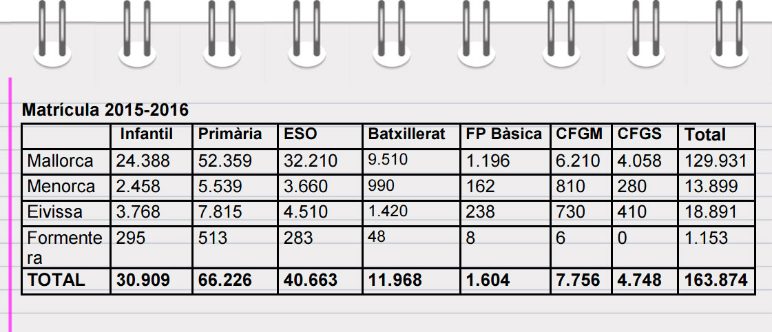 El nuevo curso contará con 15.538 plazas docentes, lo que supone un incremento de 364 puestos de trabajo en relación al ejercicio anterior, 246 de ellas en Mallorca. De estas plazas, 11.835 son en centros públicos y 3.703 en concertados.