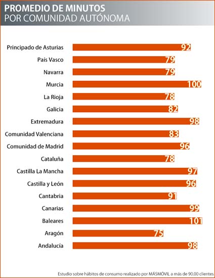 Según el estudio realizado por Másmóvil sobre los hábitos de consumo de más de 90.000 clientes en España, en el primer semestre de 2016, los baleares hablamos una media de 101 minutos al mes a través del teléfono móvil, enviamos 9 SMS y consumimos 1.389 MB de datos.