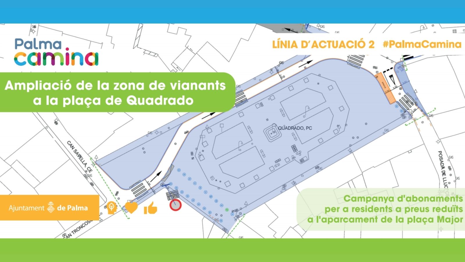 Esta medida se enmarca en el proceso de conversión de la plaza Quadrado en una plaza para peatones que tendrá lugar próximamente y que forma parte del conjunto de medidas del plan Palma Anda que está poniendo en marcha el área de Movilidad Sostenible.