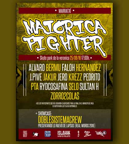 A partir de las 17h., 16 participantes competirán por hacerse con los 4 puestos de cara a la gran final que acogerá a los 8 mejores de los dos territorios, estos son los elegidos: Alvaro, Bermu, Faloh, Hernández, J.Pive, Jakur, Jero, Kreez, Pedrito, PTA, Rydcosafina, Selo, Sultan H, Zorro2colas. Cuatro de los aspirantes de Inca que no lograron clasificarse para la final, se disputarán las vacantes que quedan libres, a su vez, disfrutaremos de la puesta en escena de uno de los grupos locales más prometedores, La cara oculta. Contaremos con un comité compuesto por tres grandes entendidos en la materia de la cultura Hip Hop. Totalmente gratis.