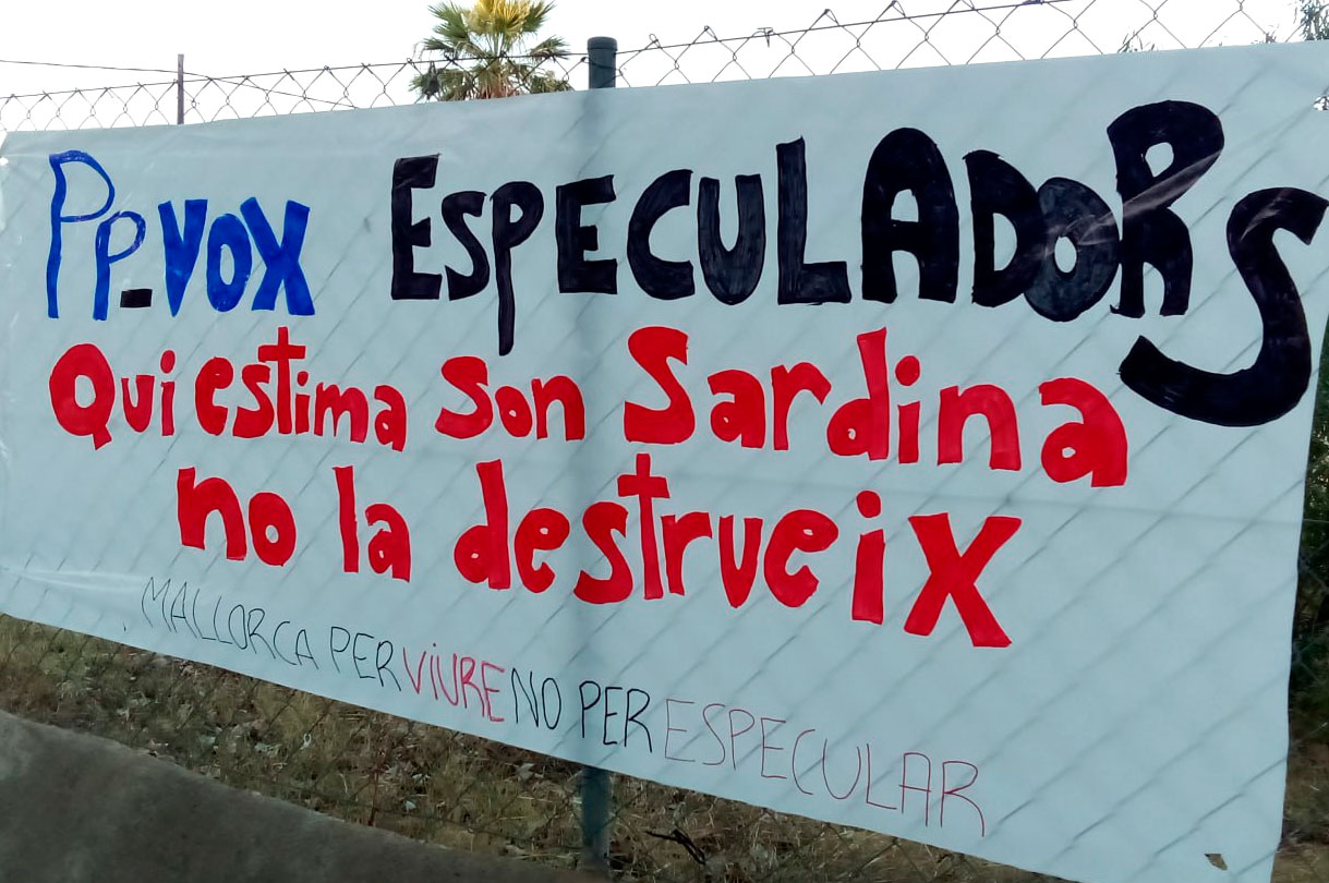 Los mensajes ya se ven en calles y fachadas: ‘la tierra no se vende, Mallorca no se especula‘. La organización acusa al gobierno municipal de impulsar una “bomba urbanística” que agravará la crisis ambiental y social de la isla. Critican además el silencio de responsables políticos con cargos importantes en el Ayuntamiento y otras instituciones.