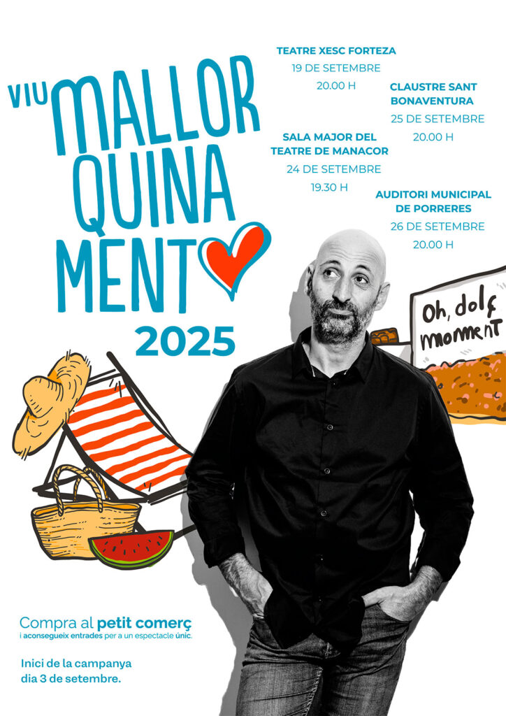 “Viu Mallorquinament” es un monólogo con elementos audiovisuales que une divulgación, crítica y humor para reflexionar sobre el papel clave que el comercio de barrio desempeña en la construcción de nuestras ciudades y en la vida comunitaria. Según el propio Toni Gomila, se trata de “un elogio a la función social del pequeño comercio en Mallorca”.