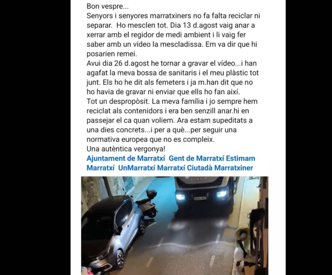 La gestión de residuos en Marratxí vuelve a estar en el punto de mira. Hay un gran malestar y algunos vecinos han denunciado en las redes sociales que el sistema de reciclaje no se está cumpliendo como debería. Aseguran que los desechos separados en casa acaban mezclados en el mismo camión de recogida.