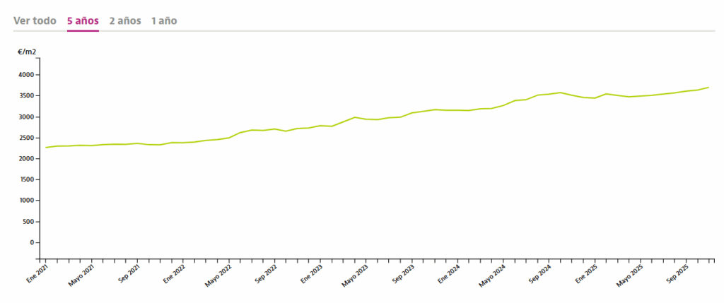 | Marratxí | 3.698 €/m² | + 1,7 % | + 3,8 % | + 5,3 % | 3.698 €/m² (nov 2025) | 0,0 % |