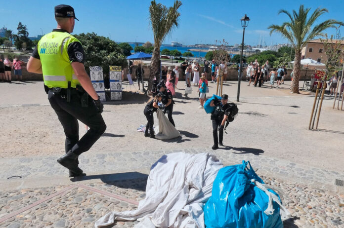La Policía Local de Palma ha llevado a cabo este jueves una acción contundente contra la venta ambulante no autorizada en algunas de las zonas más transitadas del casco antiguo. En el dispositivo, que forma parte del plan SETUR 2025, participaron 37 agentes y se contó con el apoyo táctico de la Unidad de Drones (UDROP).
