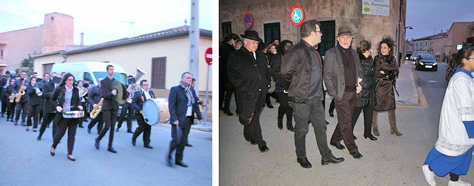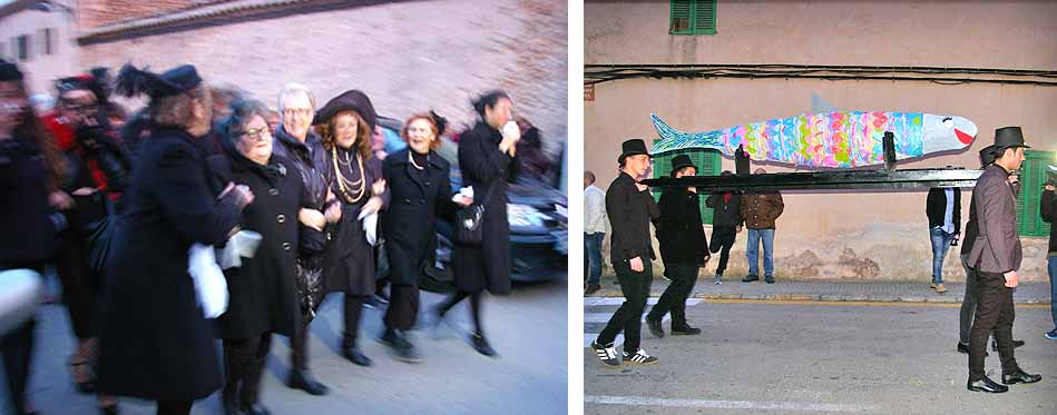La sardina transportada en hombros como a un difunto, salió del local de Ca ses Monges alrededor de las 18,15h., y estuvo acompaña en todo momento por una comitiva formada por las “plañideras”, mujeres vestidas de luto, vecinos y miembros del consistorio, encabezados todos ellos por la Banda de Música de Marratxí, que interpretó en todo momento música fúnebre.