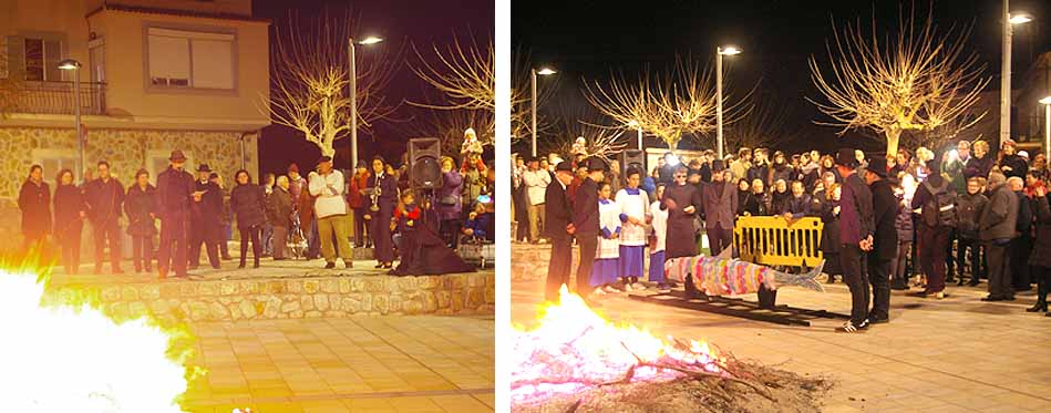 Finalizada la intervención de los políticos, se procedió, después de dar cinco vueltas alrededor de la gran hoguera situada en el centro de la plaza, a quemar la figura de la sardina en medio de llantos y gritos de dolor interpretados a la perfección por las “Plañideras”.