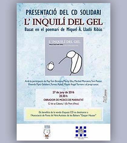 El próximo 27 de junio, a las 20,30h. en el local de s’Obrador de Músics del Camí de sa Cabana, 1 (Pont d’Inca), acogerá la presentación del CD solidario, ‘L’inquilí del gel’, del escritor residente en el Pont d’Inca, Miquel Àngel Lladó, que recoge los poemas que, a modo de relato, recorren la relación del autor con su hijo Lluís, afectado de autismo. La obra, ilustrada por alumnos de la Fundación Gaspar Hauser, ha sido editada en versión bilingüe castellano/català en un volumen especialmente cuidado.