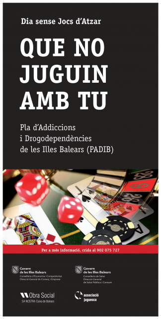 El próximo martes 29 de octubre se celebra el Día sin Juegos de Azar y la Associació Juguesca, en colaboración con el Govern (a través de sus direcciones generales de Salut Pública i Consum y de Comerç), proponen la campaña de sensibilización ‘Que no Juguin amb tu’, con una serie de actos para promover un uso responsable del juego.
