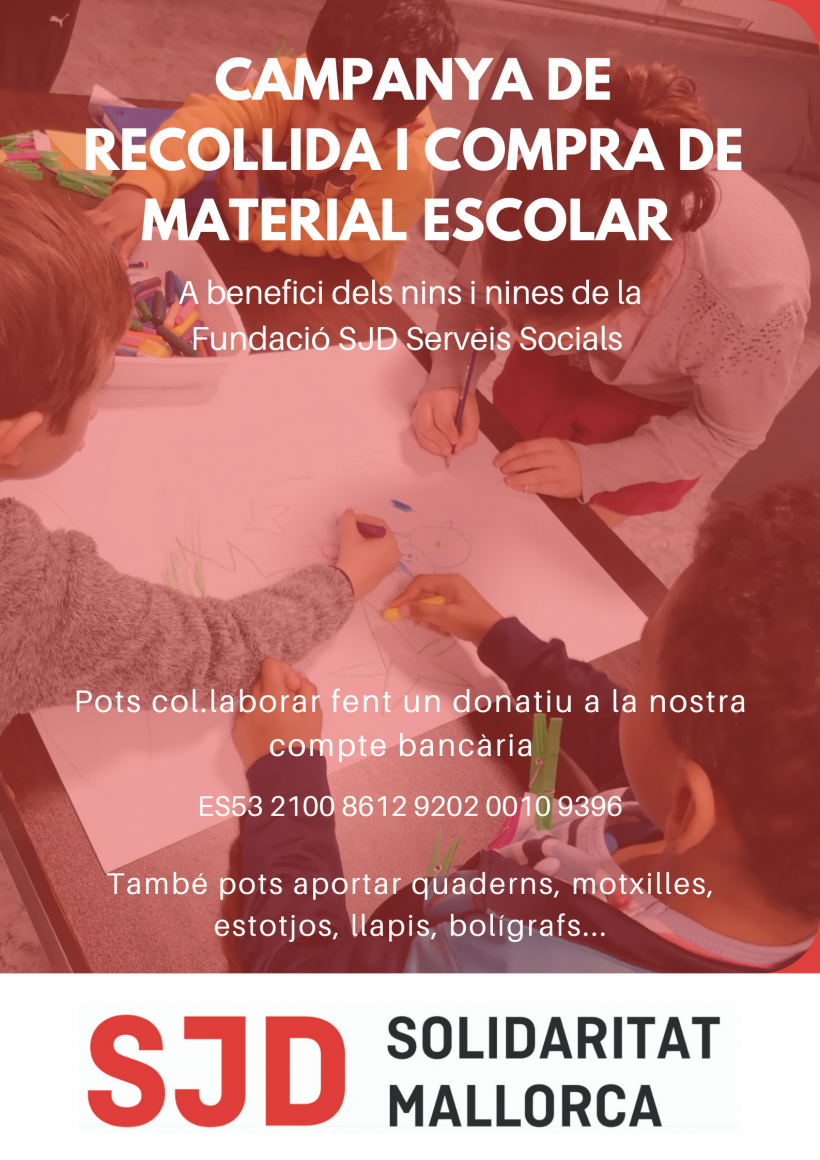 Por ello, con el comienzo del curso iniciamos la Campaña de Recogida de Material Escolar, que durará de día 10 a día 30 de septiembre y se convertirá abierta a las entradas de los Hospitales de Palma e Inca.