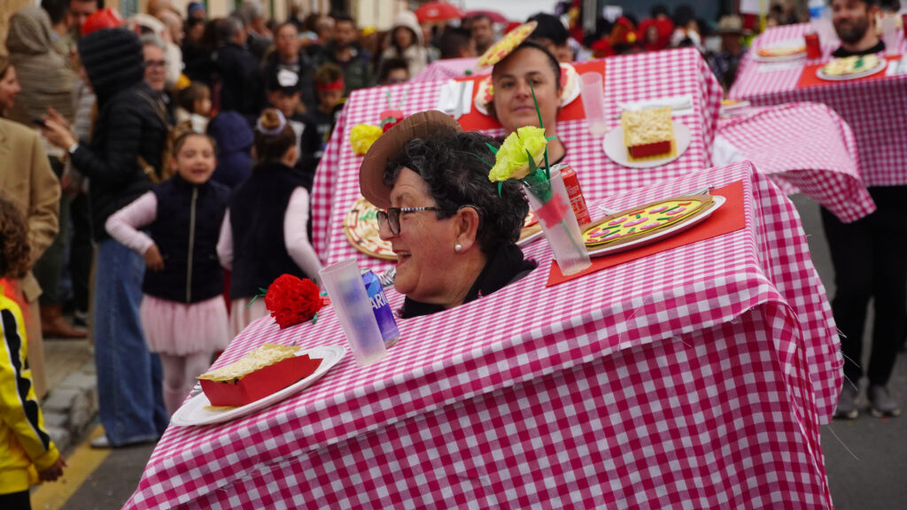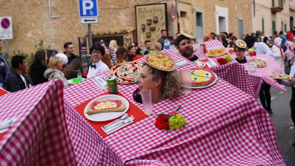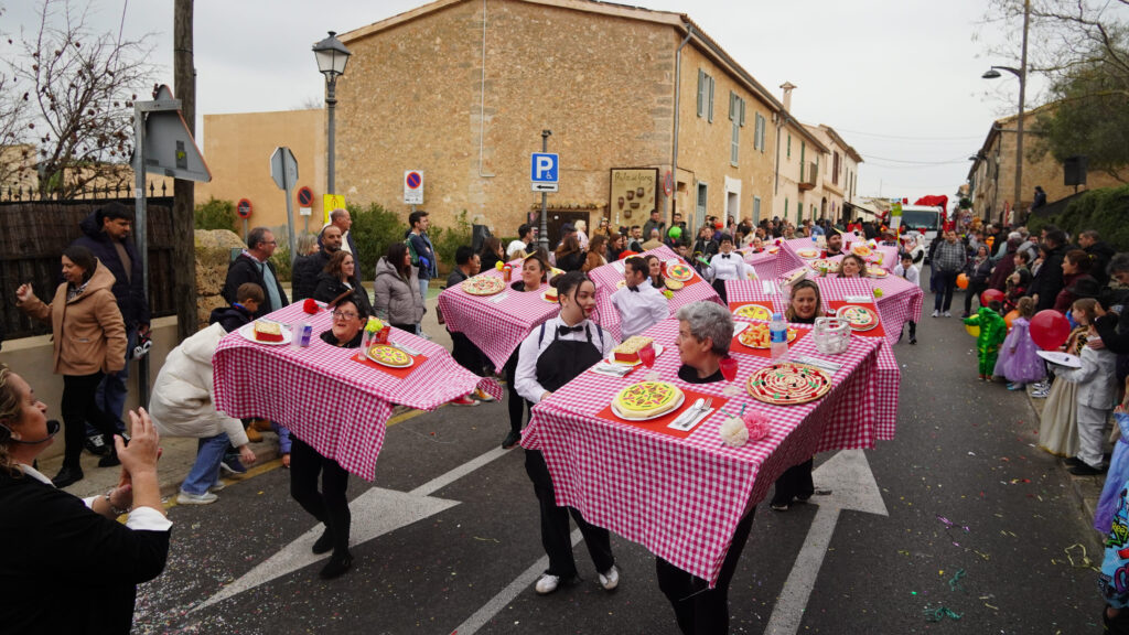Entre los grupos familiares se han podido ver disfraces de vaso de vino, pan con aceite y caracoles en platos de barro propio de la tierra. También de Apps, aplicaciones móviles como el Google Classroom o el Gestib, también de Locomotora o de los Picapedra, con sus propios vehículos incorporados en el disfraz. Entre las propuestas más llamativas ha destacado la de los vecinos de Son Ametller, que han sacado a la calle una pizzería, con una carroza y decenas de personas disfrazadas de negro con la cabeza saliendo de una mesa preparada para los comensales con manteles a cuadros, bebidas, jarrones de flores y sombreros con forma de pizza.