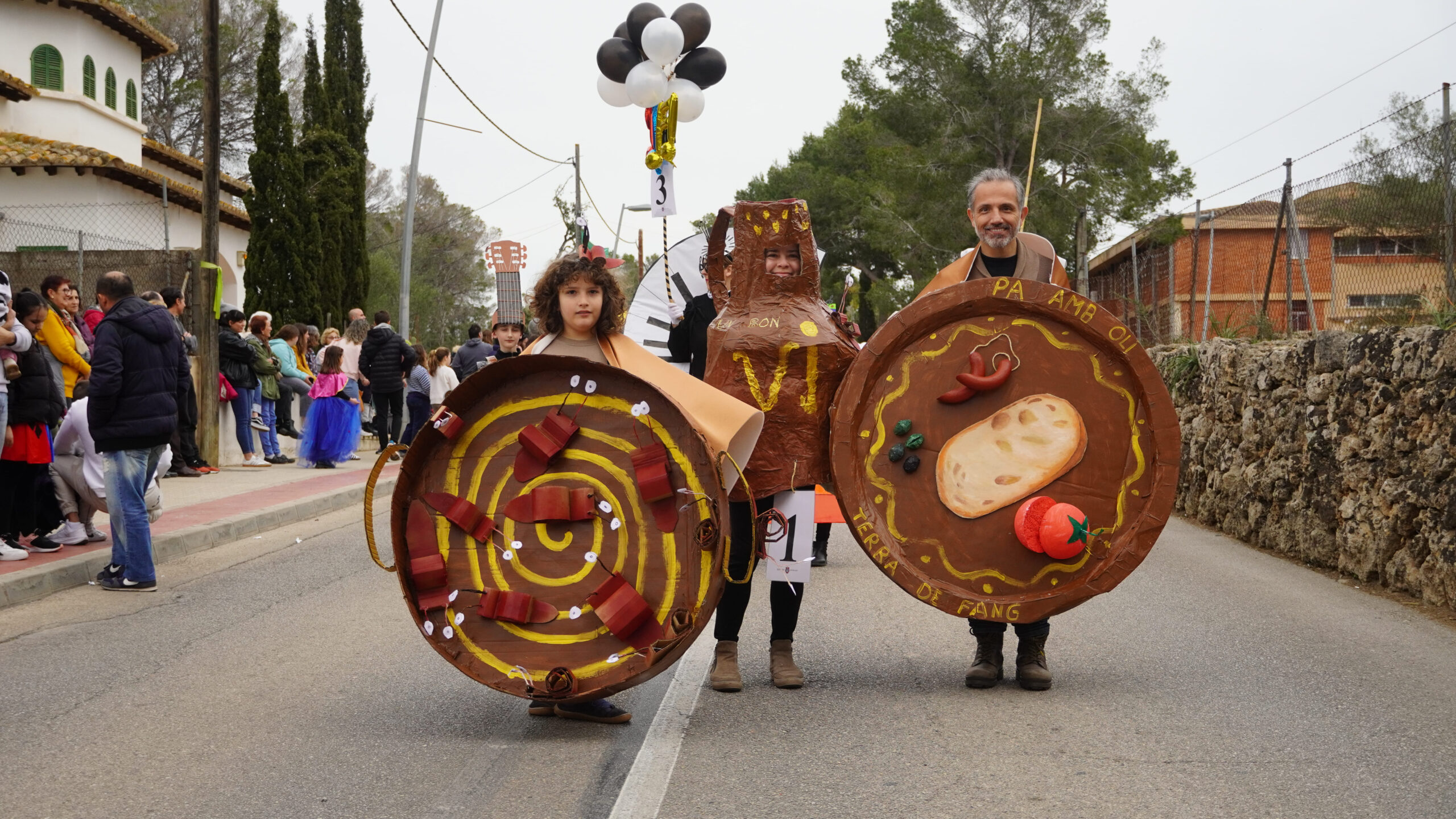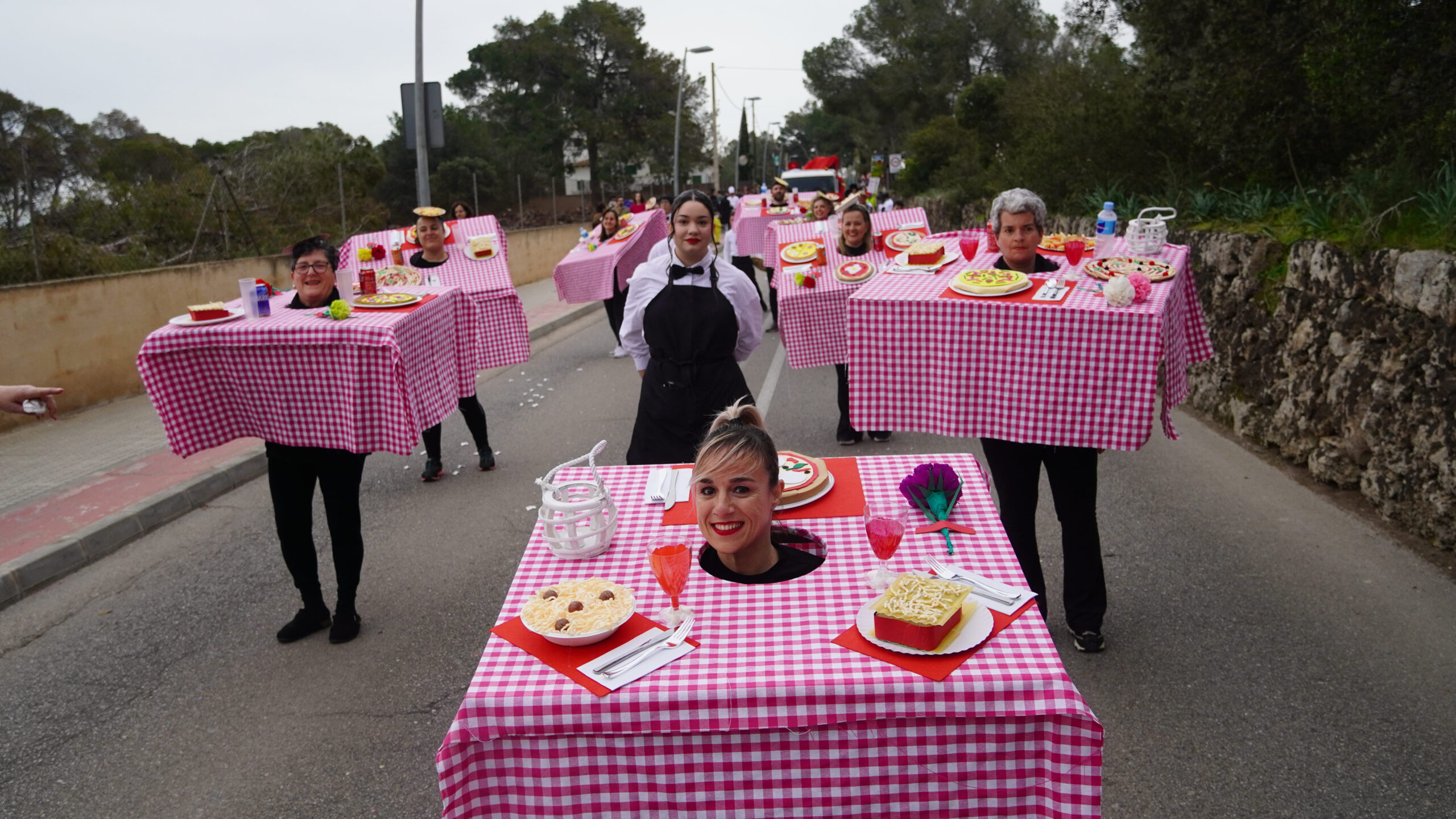 Entre los grupos familiares se han podido ver disfraces de vaso de vino, pan con aceite y caracoles en platos de barro propio de la tierra. También de Apps, aplicaciones móviles como el Google Classroom o el Gestib, también de Locomotora o de los Picapedra, con sus propios vehículos incorporados en el disfraz. Entre las propuestas más llamativas ha destacado la de los vecinos de Son Ametller, que han sacado a la calle una pizzería, con una carroza y decenas de personas disfrazadas de negro con la cabeza saliendo de una mesa preparada para los comensales con manteles a cuadros, bebidas, jarrones de flores y sombreros con forma de pizza.