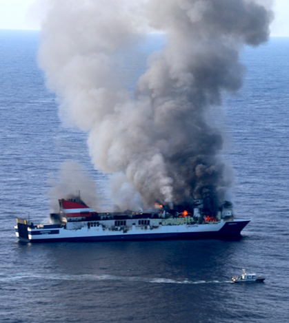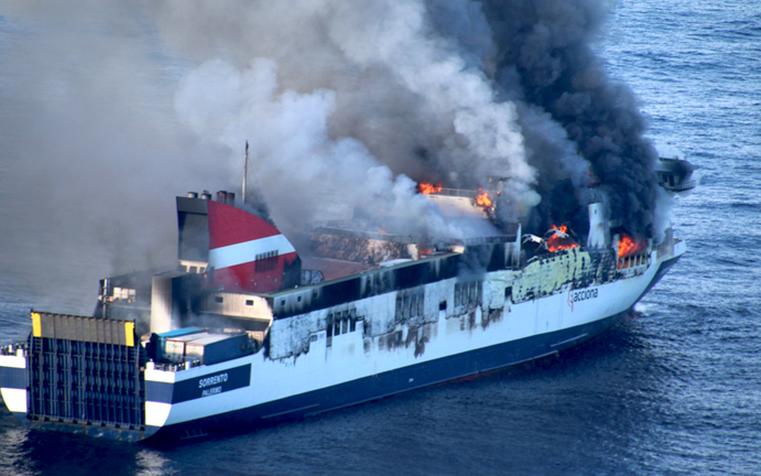 El siniestro se ha producido por la tarde, a unas 17 millas de sa Dragonera. El ferry Sorrento, de la compañía Acciona–Trasmediterránea, cubría la ruta Palma-Valencia, se ha incendiado al parecer por un cortocircuito.