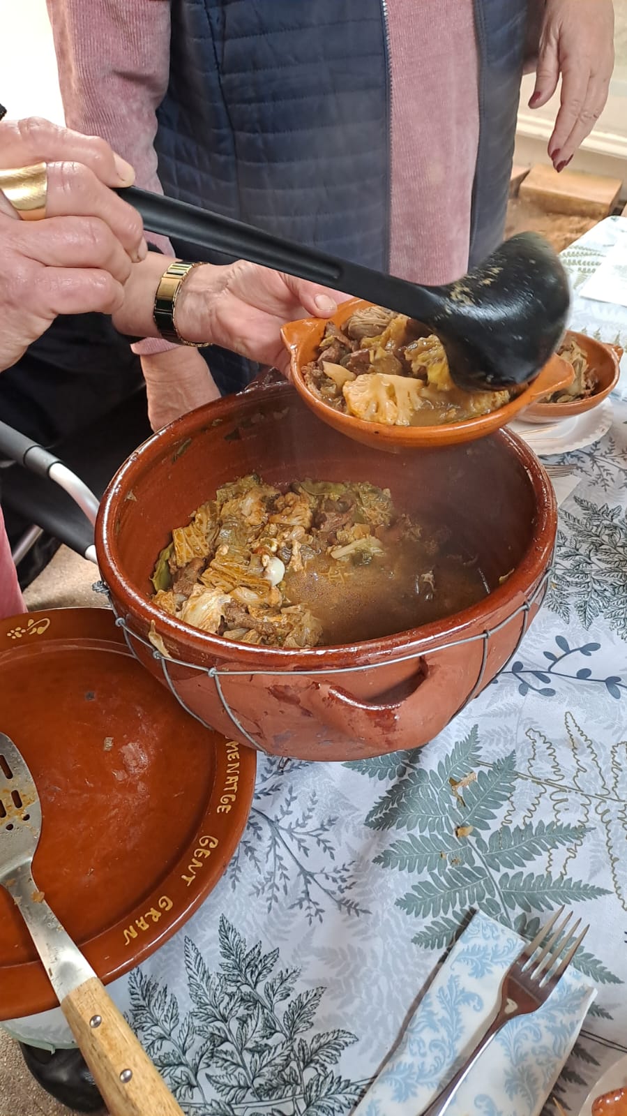 Arriba a taula la greixonera de sopes, sopes escaldades amb picornells, i en treure la