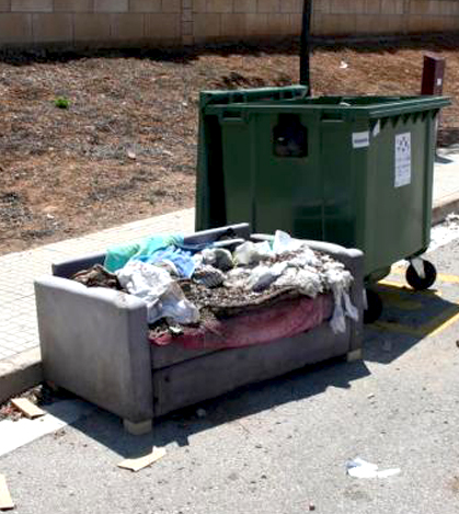 Todas las tardes a partir de las 18:00 vemos como muchas furgonetas pasan por los contenedores de basura recogiendo hierro, el otro dia no me dio tiempo a coger la matricula de este vehiculo que dejo este sofa, y la.policia para que esta.?? A ver si en vez de tener un policia metido en un coche camuflado con el radar, utilizan este servicio para ver a los sirvenguenzas que tiran escombros.