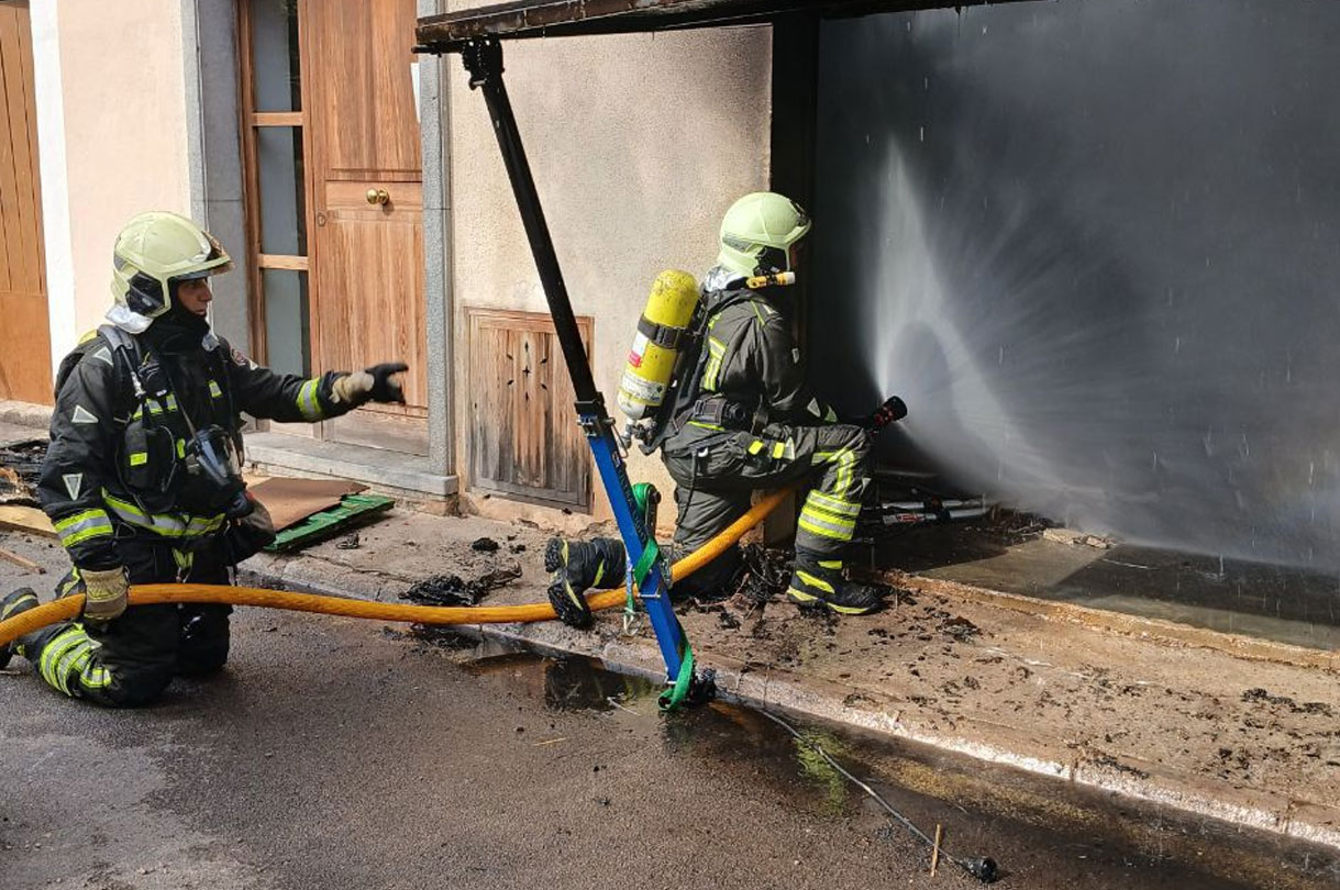 Efectivos de los Bombers de Mallorca se han empleado intensamente este sábado para sofocar un incendio declarado en una carpintería ubicada en la planta baja de un edificio del Camí des Camp Llarg, en Sóller.