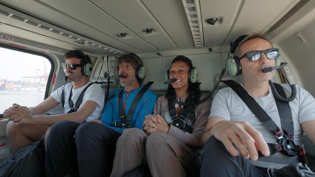 Nada más llegar, el grupo afronta un trayecto intenso y divertido a partes iguales en un helicóptero que les deposita en plena montaña, en el entorno de Whistler. Allí les espera Calleja con el primer gran desafío del viaje: atravesar una vía ferrata suspendida sobre profundos precipicios, una prueba que obliga a los invitados a enfrentarse de inmediato a sus miedos y a sus propios límites físicos.
